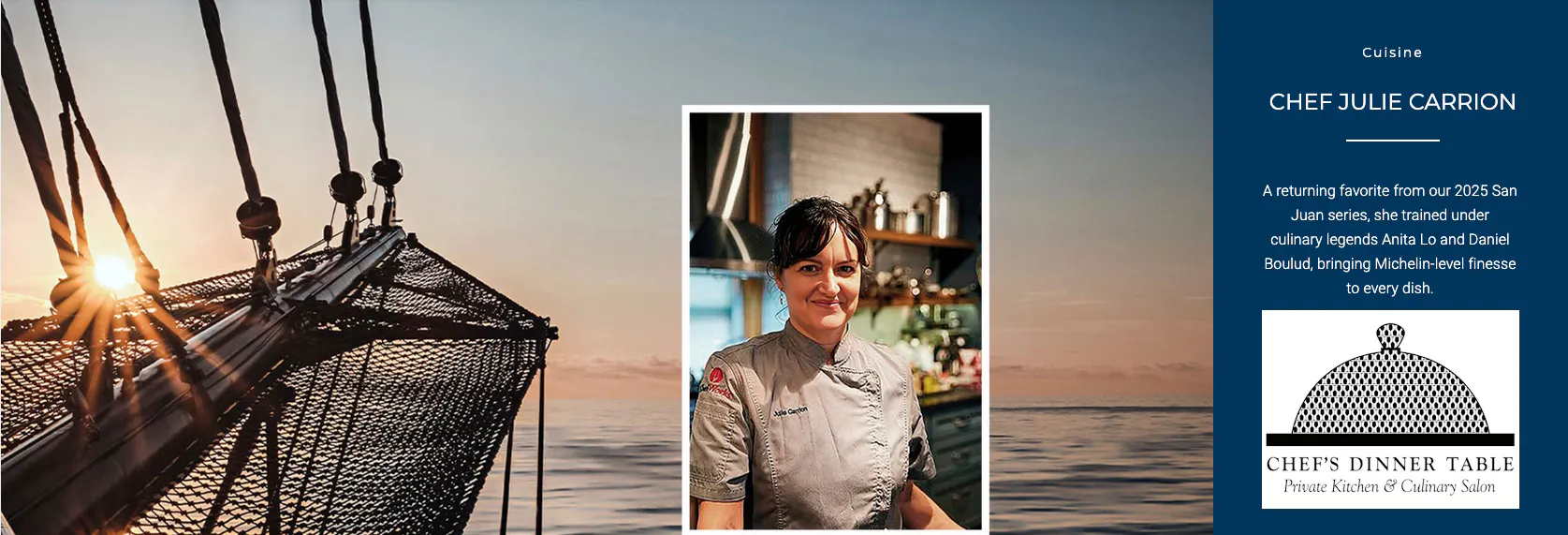 Chef's Dinner Table invites you to celebrate our partnership with Sea Cloud Cruises, one of the world's most illustrious names in cruising, as we announce that Chef Julie Carrión will board the Sea Cloud Spirit for the July 26, 2026 Azores sailings! To see the full itinerary, click here!